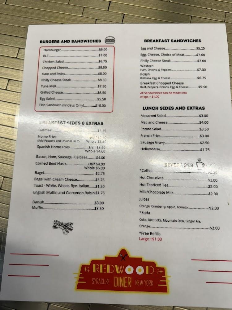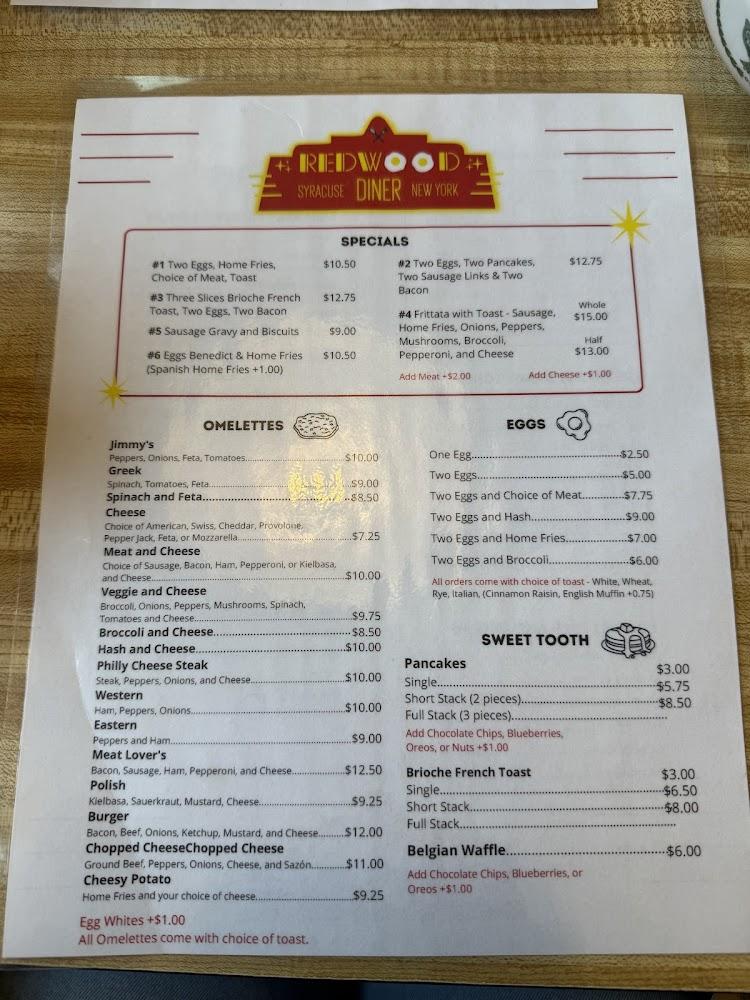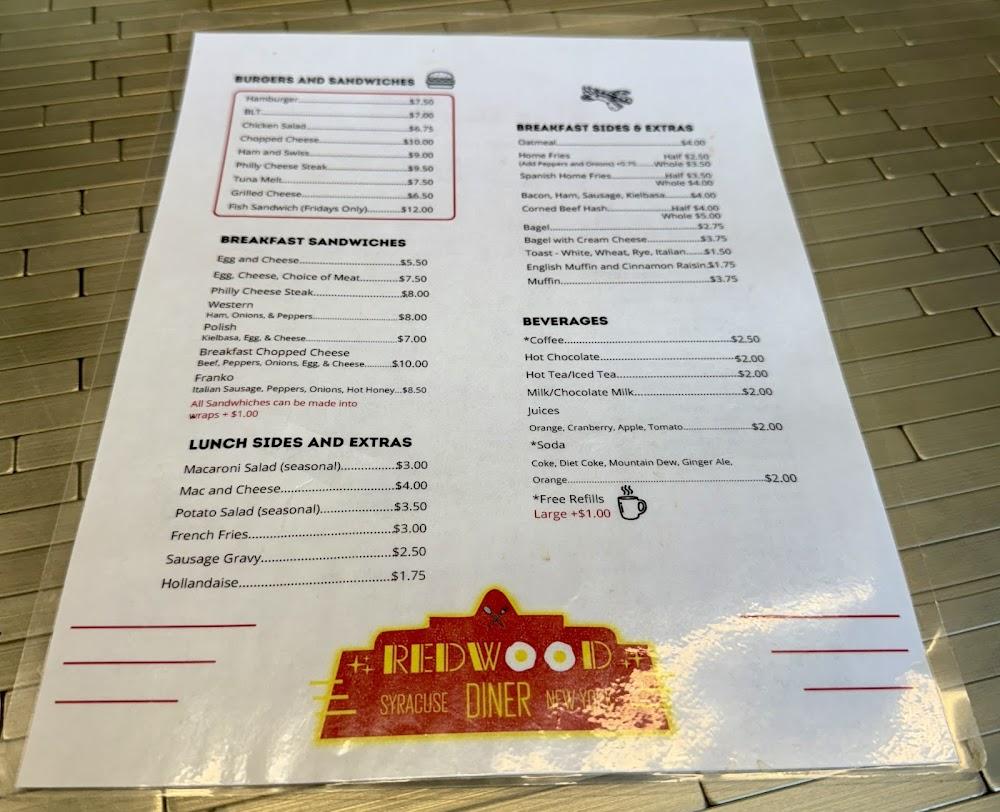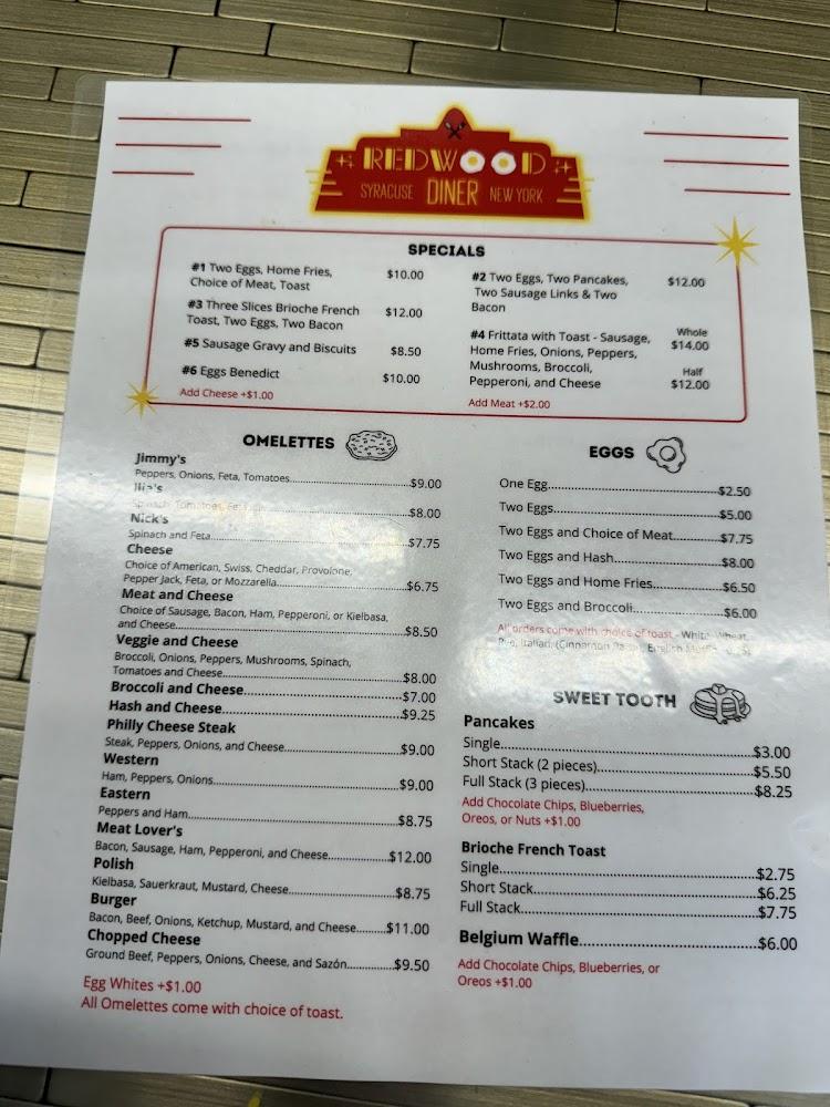 Welcome to Redwood Diner, your go-to classic American eatery located at 121 E Manlius St, East Syracuse, NY. Known for its laid-back atmosphere and excellent coffee, our diner serves up a mouthwatering array of breakfast, brunch, and lunch options, alongside local specialties. Enjoy a delightful meal, whether you choose to dine solo, take out, or indulge in our sit-down service. With accessible facilities, ample parking, and kid-friendly amenities, we cater to everyone. Join us for a cozy dining experience where comfort food meets community spirit, all at an affordable price!